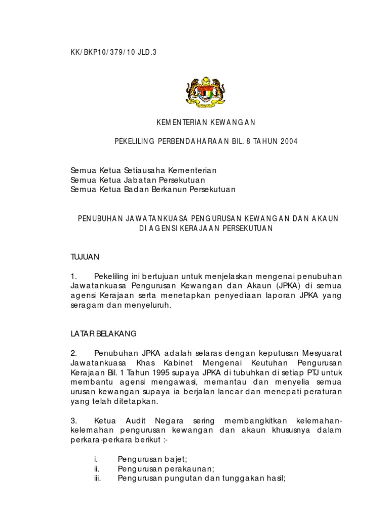 Peraturan pembayaran imbuhan bagi tahun 1995 kepada pegawai sektor awam. Surat pekeliling perbendaharaan negeri pahang bilangan 2 tahun 2017 ( pelaporan kutipan hasil dan akaun belum terima ). 2 tahun 1980 peraturan mengenai penggunaan, pengurusan dan penyenggaraan. 2 penggunaan, penyimpanan & pemeriksaan kandungan tpa pendahuluan bab a. 1 pekeliling perbendaharaan tatacara pengurusan aset alih kerajaan (tpa) pekeliling perbendaharaan bil.