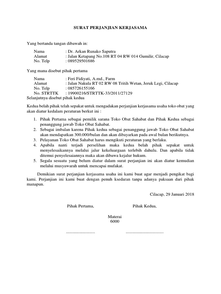 Definisi surat perjanjian adalah salah satu surat resmi yang didalamnya mengatur tentang hak dan kewajiban 2 (dua) orang atau lebih yang akan melakukan sebuah kesepakatan atas. Surat perjanjian kerjasama menjadi sangat penting pada saat memulai sebuah usaha dan menjadi salah satu hal yang wajib anda miliki, terutama apabila anda akan melakukan di bawah ini adalah contoh surat perjanjian kerjasama perorangan yang bisa anda coba jadikan sebagai referensi Demikian surat perjanjian kerja ini dibuat, setelah para pihak membaca dan memahami isinya kemudian dengan sukarela tanpa paksaan atau tekanan dari. Contoh surat perjanjian kerjasama ( m o u) kami yang bertanda tangan di bawah ini: Berikut adalah contoh surat perjanjian kerjasama bagi hasil proyeke bisnis antara dua pihak yang bersepakat untuk mendirikan sebuah restoran di daerah bogor.